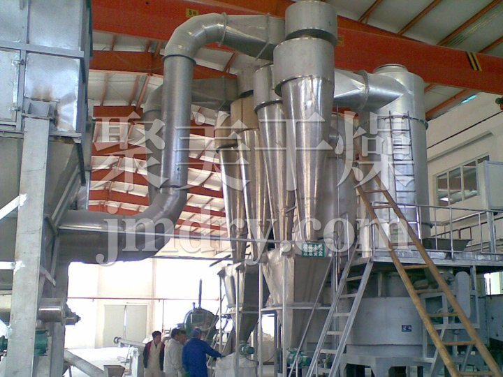 流化床干燥機是由物料自進料進口進入機內(nèi),在振動力作用下,物料沿水平面流化床拋擲,向前連續(xù)運動,熱風(fēng)向上穿過流化床同濕物料換熱后,濕空氣經(jīng)旋風(fēng)